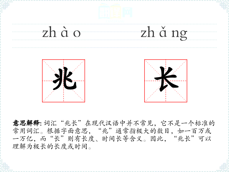 词汇“兆长”在现代汉语中并不常见,它不是一个标准的常用词汇。根据字面意思,“兆”通常指极大的数目,如一百万或一万亿,而“长”则有长度、时间长等含义。因此,“兆长”可以理解为极长的长度或时间。