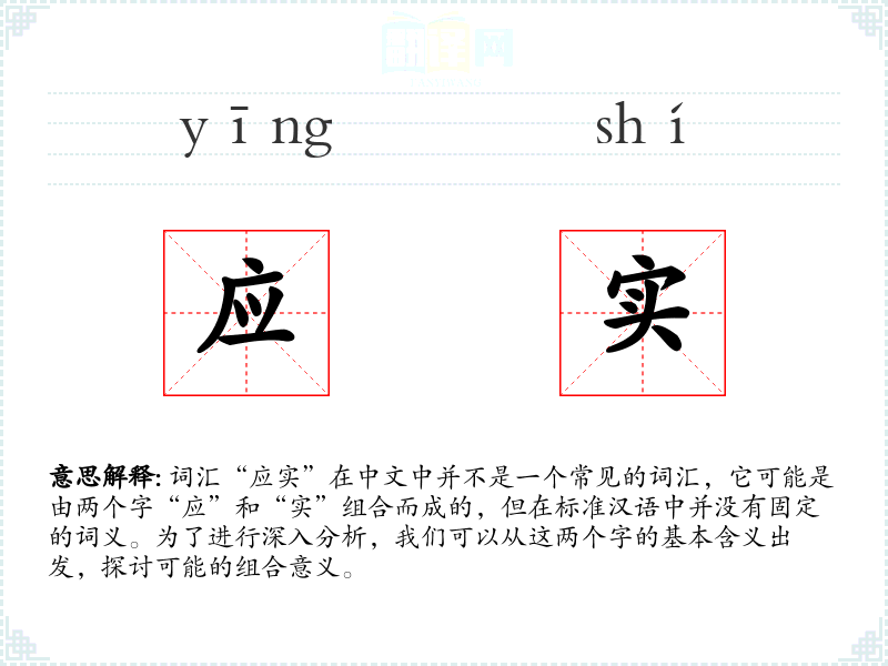 尽管“应实”不是一个标准词汇,通过对“应”和“实”两个字的基本含义的分析,我们可以理解它在强调实际性和真实性方面的潜在用途。在语言学习和表达中,理解词汇的基本含义和可能的组合意义对于丰富表达方式和理解他人意图都是非常重要的。