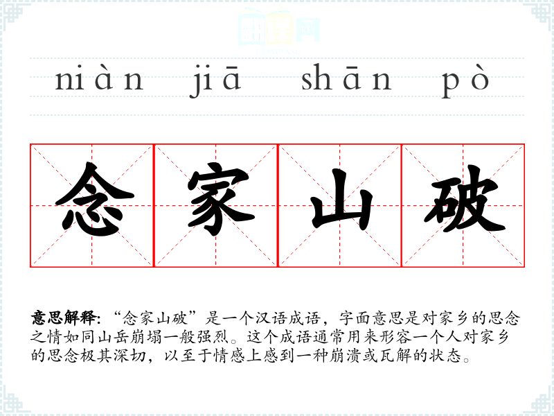 “念家山破”是一个汉语成语,字面意思是对家乡的思念之情如同山岳崩塌一般强烈。这个成语通常用来形容一个人对家乡的思念极其深切,以至于情感上感到一种崩溃或瓦解的状态。