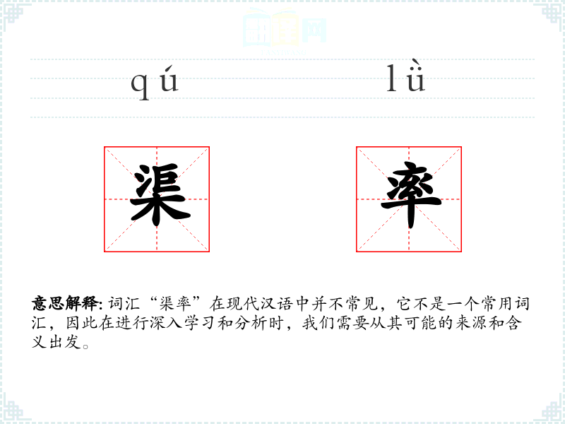 由于“渠率”不是一个常用词汇,它在不同语境下的使用非常有限。在古代文献或特定专业领域(如水利工程)中,可能会有使用到这个词的情况,但具体含义需要结合上下文来理解。