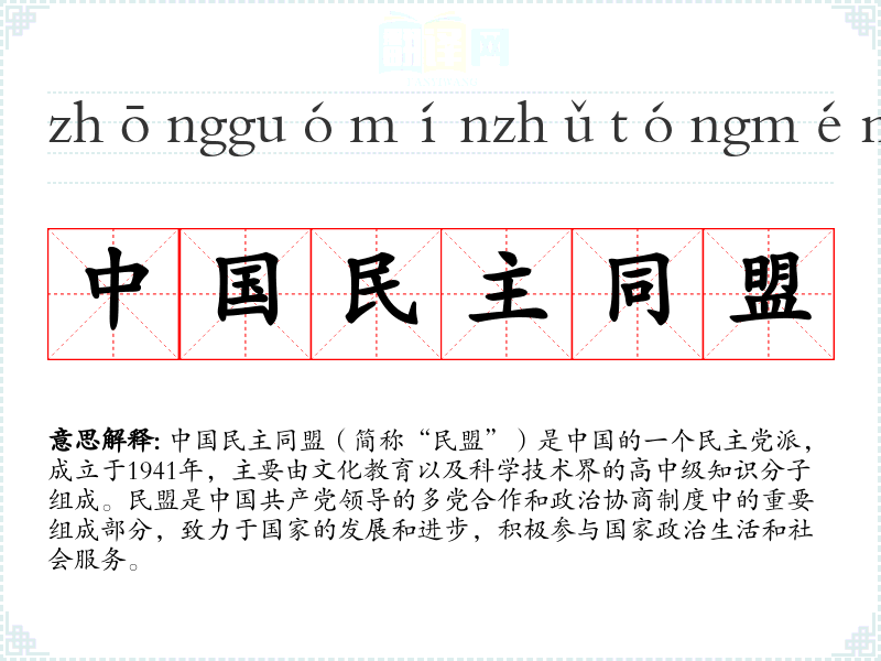 - zhōng guó mín zhǔ tóng méng中国民主同盟