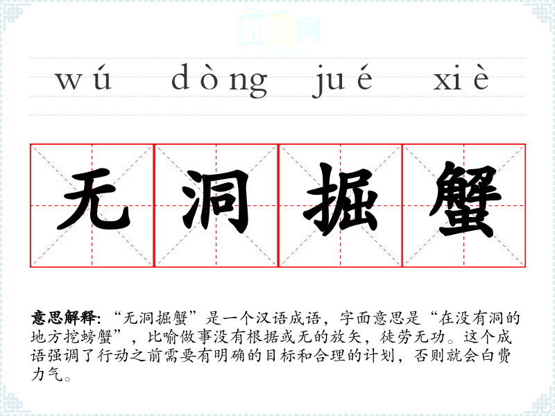 “无洞掘蟹”是一个汉语成语,字面意思是“在没有洞的地方挖螃蟹”,比喻做事没有根据或无的放矢,徒劳无功。这个成语强调了行动之前需要有明确的目标和合理的计划,否则就会白费力气。