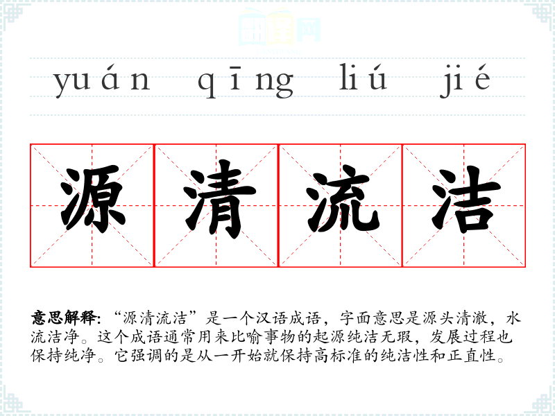 “源清流洁”是一个汉语成语,字面意思是源头清澈,水流洁净。这个成语通常用来比喻事物的起源纯洁无瑕,发展过程也保持纯净。它强调的是从一开始就保持高标准的纯洁性和正直性。