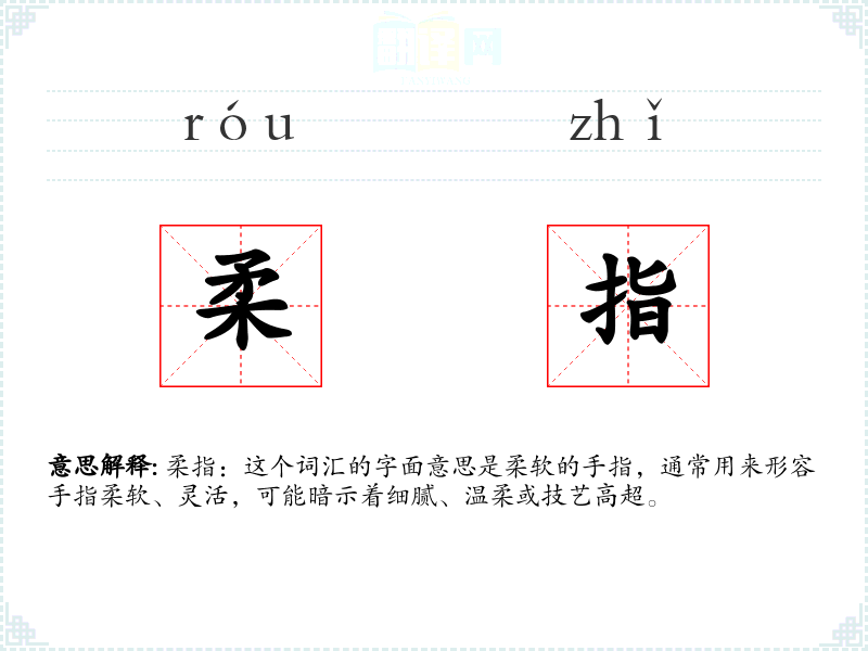 柔指:这个词汇的字面意思是柔软的手指,通常用来形容手指柔软、灵活,可能暗示着细腻、温柔或技艺高超。