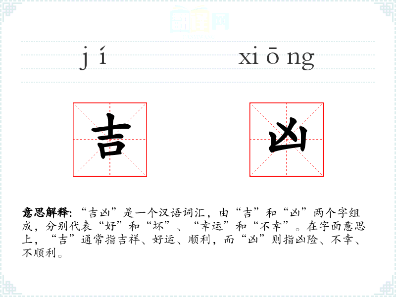 “吉凶”是一个汉语词汇,由“吉”和“凶”两个字组成,分别代表“好”和“坏”、“幸运”和“不幸”。在字面意思上,“吉”通常指吉祥、好运、顺利,而“凶”则指凶险、不幸、不顺利。