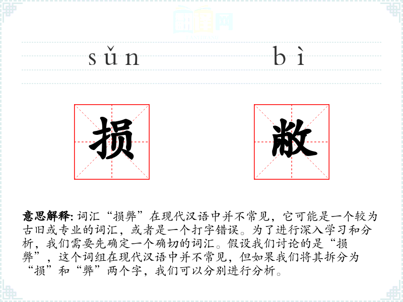 词汇“损弊”在现代汉语中并不常见,它可能是一个较为古旧或专业的词汇,或者是一个打字错误。为了进行深入学习和分析,我们需要先确定一个确切的词汇。假设我们讨论的是“损弊”,这个词组在现代汉语中并不常见,但如果我们将其拆分为“损”和“弊”两个字,我们可以分别进行分析。