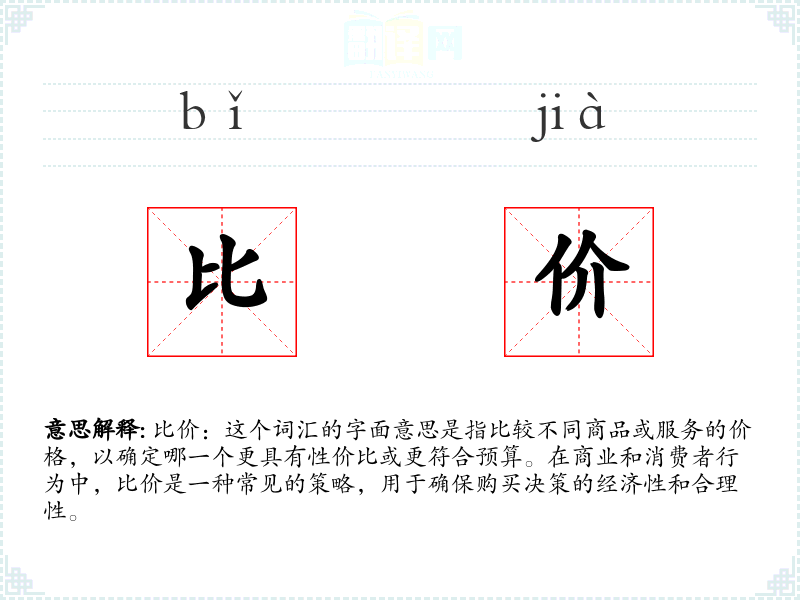 比价:这个词汇的字面意思是指比较不同商品或服务的价格,以确定哪一个更具有性价比或更符合预算。在商业和消费者行为中,比价是一种常见的策略,用于确保购买决策的经济性和合理性。