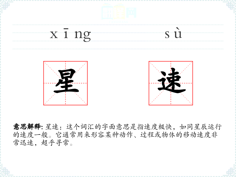 “星速”这个词汇可能是现代汉语中新创造的词汇,结合了“星”和“速”两个字,用以形容速度极快。在古代汉语中,类似的表达可能使用“星驰”等词汇来表示速度快。