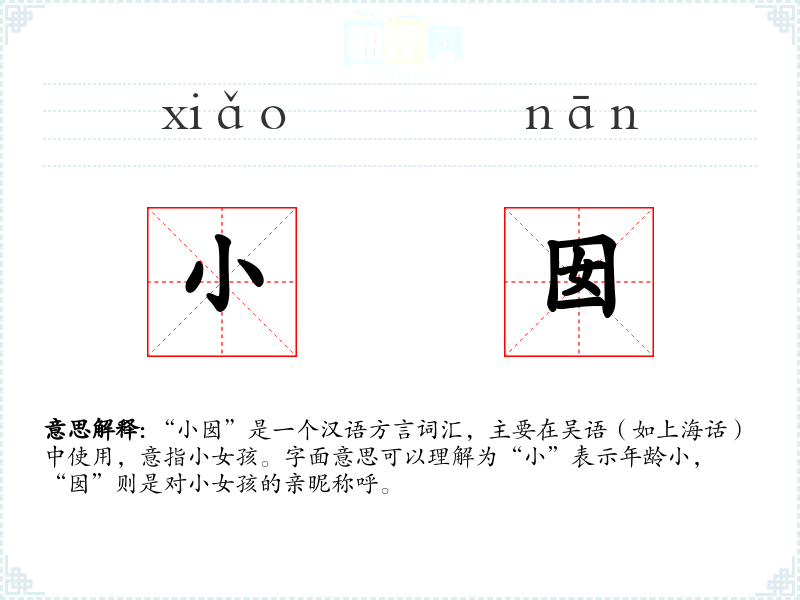 “小囡”是一个汉语方言词汇,主要在吴语(如上海话)中使用,意指小女孩。字面意思可以理解为“小”表示年龄小,“囡”则是对小女孩的亲昵称呼。