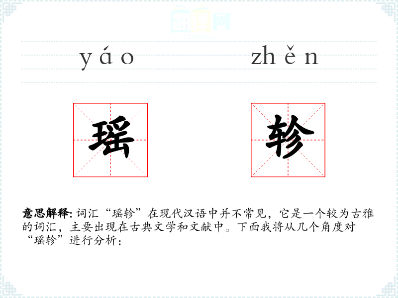 “瑶轸”是一个充满古典韵味的词汇,它不仅体现了古代汉语的丰富性和细腻性,也反映了中华文化中对美好事物的追求和赞美。虽然现代汉语中很少使用这个词汇,但了解它有助于我们更好地理解**的文化遗产和语言的多样性。