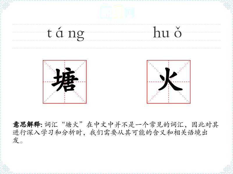 词汇“塘火”在中文中并不是一个常见的词汇,因此对其进行深入学习和分析时,我们需要从其可能的含义和相关语境出发。