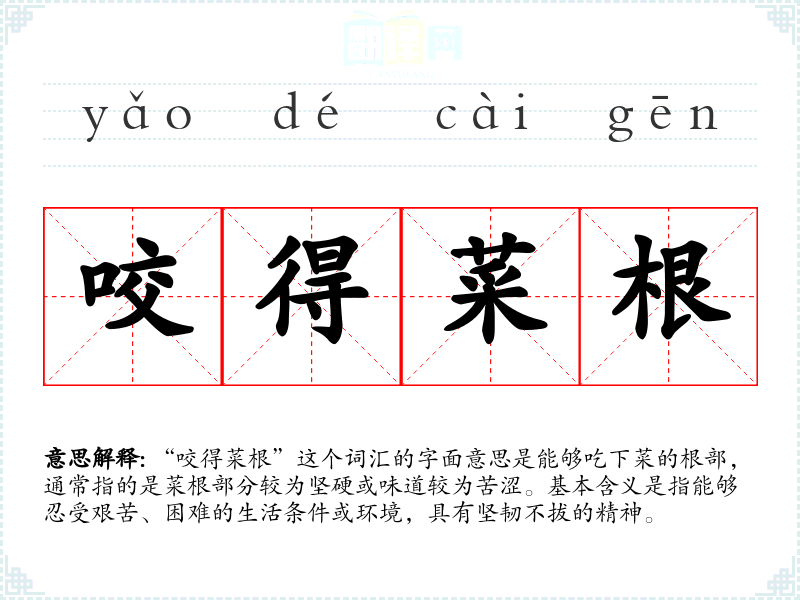 “咬得菜根”这个词汇的字面意思是能够吃下菜的根部,通常指的是菜根部分较为坚硬或味道较为苦涩。基本含义是指能够忍受艰苦、困难的生活条件或环境,具有坚韧不拔的精神。
