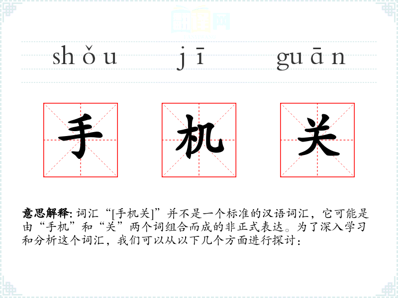 词汇“[手机关]”并不是一个标准的汉语词汇,它可能是由“手机”和“关”两个词组合而成的非正式表达。为了深入学习和分析这个词汇,我们可以从以下几个方面进行探讨: