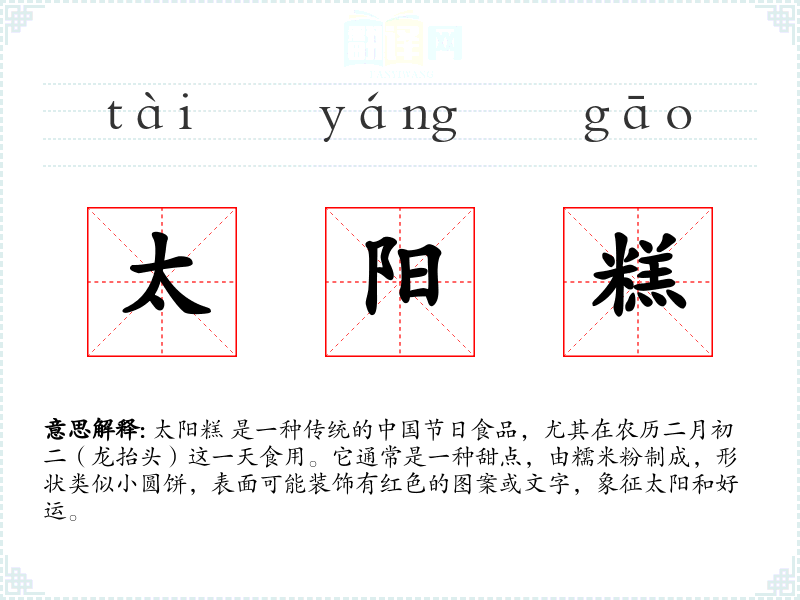 太阳糕 是一种传统的**节日食品,尤其在农历二月初二(龙抬头)这一天食用。它通常是一种甜点,由糯米粉制成,形状类似小圆饼,表面可能装饰有红色的图案或文字,象征太阳和好运。