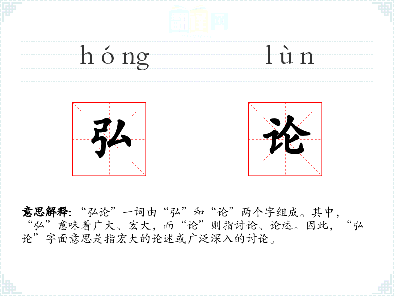 “弘论”一词由“弘”和“论”两个字组成。其中,“弘”意味着广大、宏大,而“论”则指讨论、论述。因此,“弘论”字面意思是指宏大的论述或广泛深入的讨论。