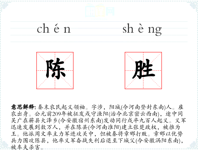 1.秦末农民起义领袖。字涉,阳城(今河南登封东南)人。雇农出身。公元前209年被征发戍守渔阳(治今北京密云西南),途中同吴广在蕲县大泽乡(今安徽宿州东南)发动同行戍卒九百人起义。义军迅速发展到数万人,并在陈县(今河南淮阳)建立张楚政权,被推为王。他派周文率主力军进攻关中,但被秦将章邯打败。章邯以优势兵力围攻陈县,他率义军奋战失利后退至下城父(今安徽涡阳东南),被车夫杀害。