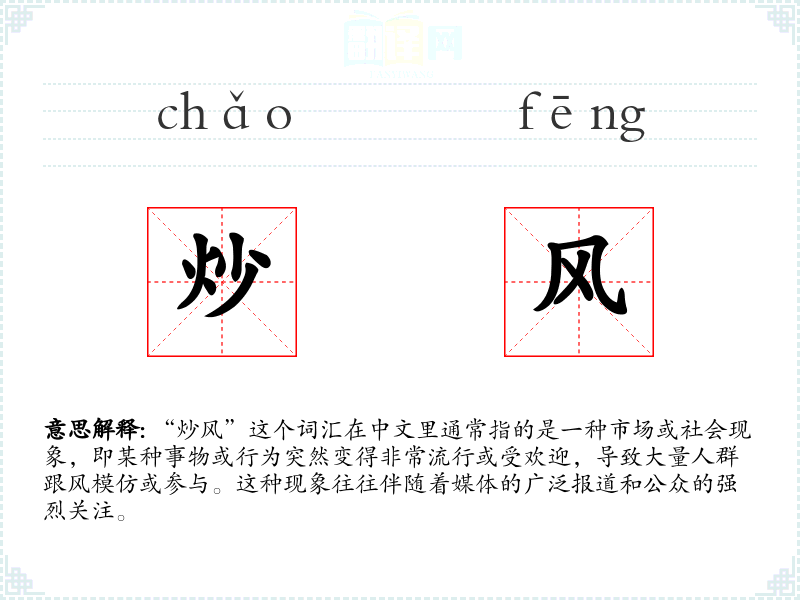 在英语中,类似的词汇可能是“fad”或“trend”,它们也用来描述短暂或流行的现象,但“炒风”更强调的是一种社会集体行为和媒体的推动作用。