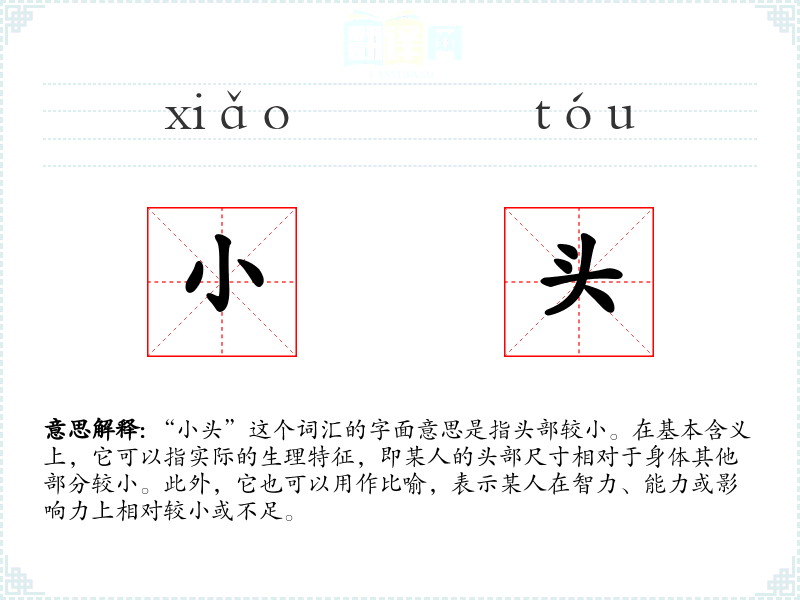 “小头”这个词汇的字面意思是指头部较小。在基本含义上,它可以指实际的生理特征,即某人的头部尺寸相对于身体其他部分较小。此外,它也可以用作比喻,表示某人在智力、能力或影响力上相对较小或不足。