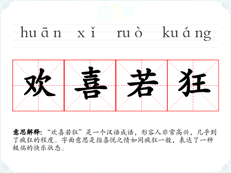 “欢喜若狂”是一个汉语成语,形容人非常高兴,几乎到了疯狂的程度。字面意思是指喜悦之情如同疯狂一般,表达了一种极端的快乐状态。