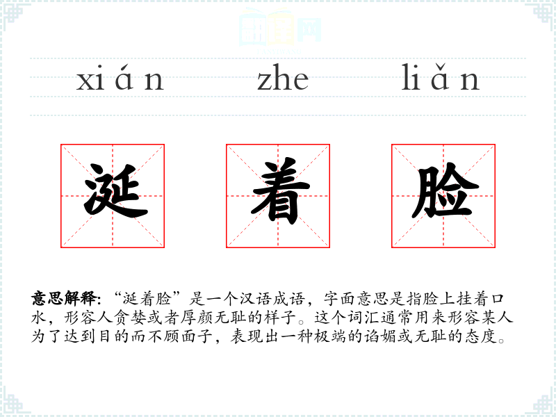“涎着脸”是一个汉语成语,字面意思是指脸上挂着口水,形容人贪婪或者厚颜无耻的样子。这个词汇通常用来形容某人为了达到目的而不顾面子,表现出一种极端的谄媚或无耻的态度。