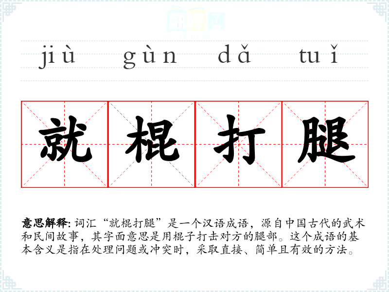 词汇“就棍打腿”是一个汉语成语,源自**古代的武术和民间故事,其字面意思是用棍子打击对方的腿部。这个成语的基本含义是指在处理问题或冲突时,采取直接、简单且有效的方法。