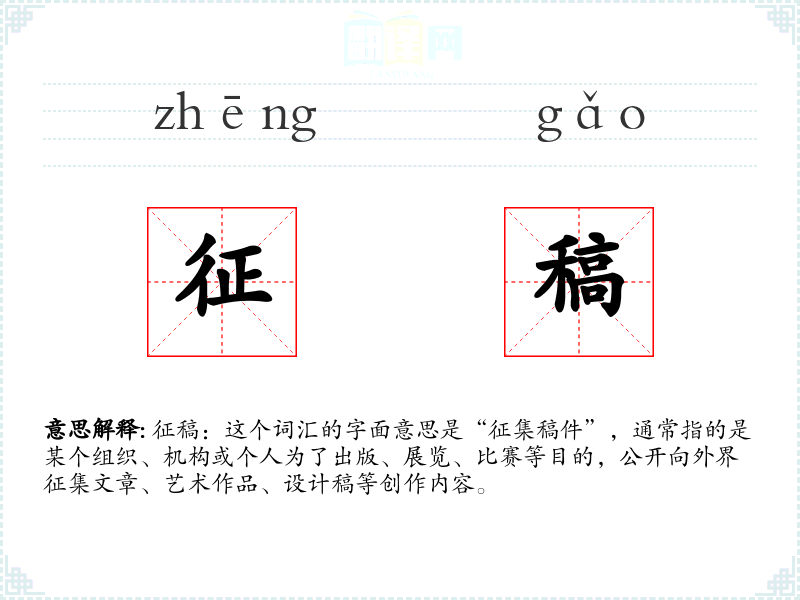 征稿:这个词汇的字面意思是“征集稿件”,通常指的是某个组织、机构或个人为了出版、展览、比赛等目的,公开向外界征集文章、艺术作品、设计稿等创作内容。