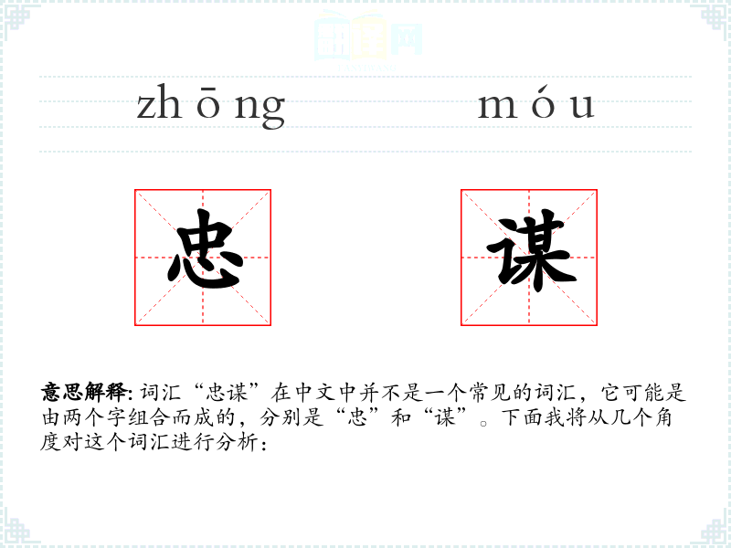 词汇“忠谋”在中文中并不是一个常见的词汇,它可能是由两个字组合而成的,分别是“忠”和“谋”。下面我将从几个角度对这个词汇进行分析: