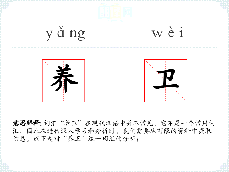 词汇“养卫”在现代汉语中并不常见,它不是一个常用词汇,因此在进行深入学习和分析时,我们需要从有限的资料中提取信息。以下是对“养卫”这一词汇的分析: