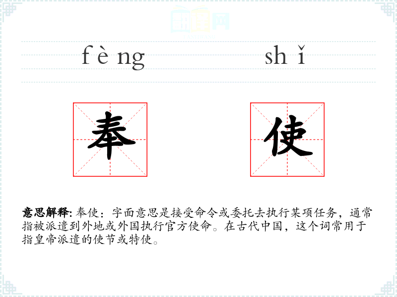 - 文学:在古典文学中,“奉使”常用于描述历史**或外交场合,如《史记》中记载的使节出使他国的情景。