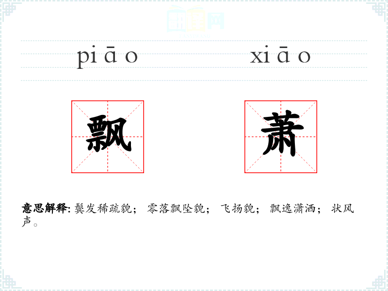 鬓发稀疏貌; 零落飘坠貌; 飞扬貌; 飘逸潇洒; 状风声。