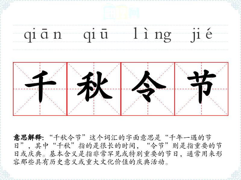 “千秋”一词源自**古代,原指千年,后来引申为很长的时间。“令节”则是指节日,特别是重要的节日。这个词汇的组合可能是现代汉语中为了强调某个节日的特殊性和重要性而创造的。