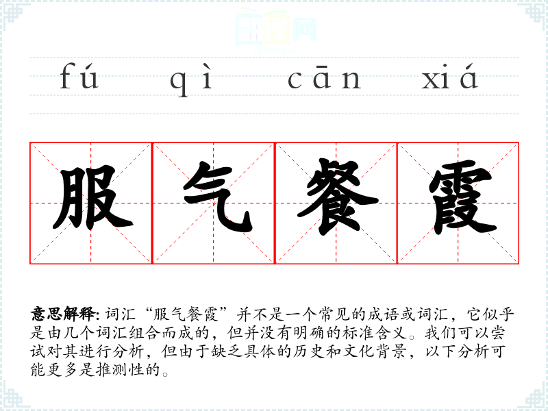 词汇“服气餐霞”并不是一个常见的成语或词汇,它似乎是由几个词汇组合而成的,但并没有明确的标准含义。我们可以尝试对其进行分析,但由于缺乏具体的历史和文化背景,以下分析可能更多是推测性的。