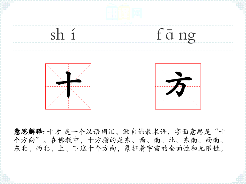 - 反义词:无(由于十方是一个特定的**术语,没有直接的反义词)