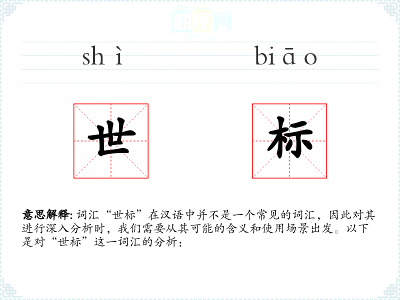 词汇“世标”在汉语中并不是一个常见的词汇,因此对其进行深入分析时,我们需要从其可能的含义和使用场景出发。以下是对“世标”这一词汇的分析: