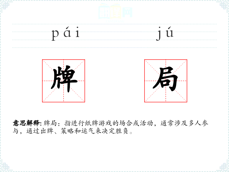 牌局:指进行纸牌游戏的场合或活动,通常涉及多人参与,通过出牌、策略和运气来决定胜负。