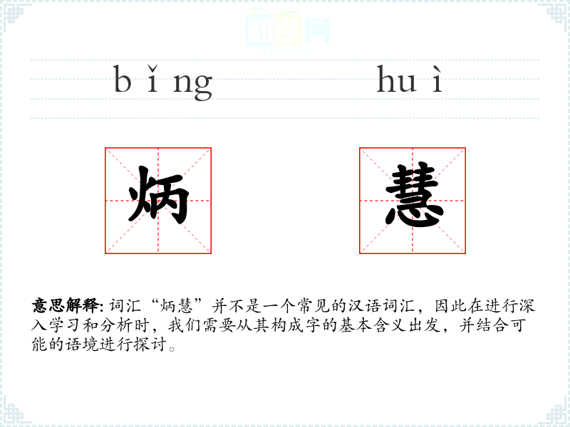 词汇“炳慧”并不是一个常见的汉语词汇,因此在进行深入学*和分析时,我们需要从其构成字的基本含义出发,并结合可能的语境进行探讨。