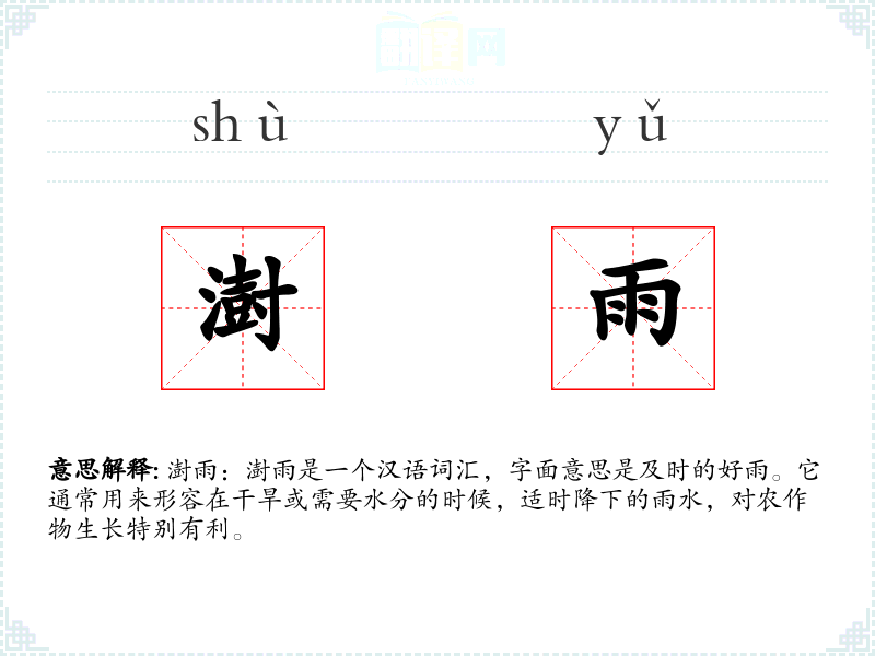 澍雨:澍雨是一个汉语词汇,字面意思是及时的好雨。它通常用来形容在干旱或需要水分的时候,适时降下的雨水,对农作物生长特别有利。