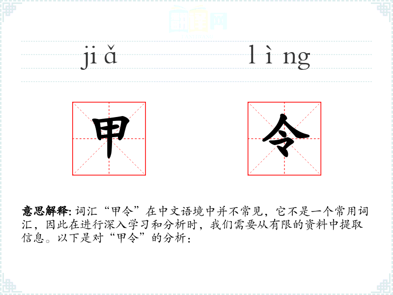 由于“甲令”不是一个常用词汇,它在现代文学、口语或专业领域中的使用非常有限。在古代文献或历史记载中,可能会出现“甲令”来表示**或高级官员下达的最高级别命令。