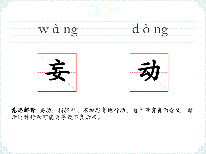 妄动是一个提醒我们在行动前要深思熟虑的词汇。它不仅在语言中有着重要的位置,也在文化和个人经验中扮演着警示的角色。通过学*和理解“妄动”,我更加明白了谨慎和计划的重要性。