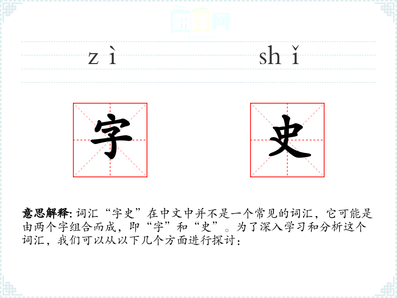 对于学*汉语的人来说,了解“字史”可以增加对汉字文化的尊重和兴趣,同时也能够更好地理解汉字的深层含义。