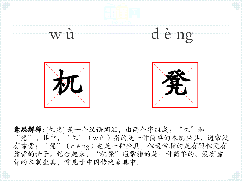 - 同义词:板凳、矮凳、小凳子。这些词汇都指的是类似的简单坐具,但“杌凳”更具有传统和文化色彩。