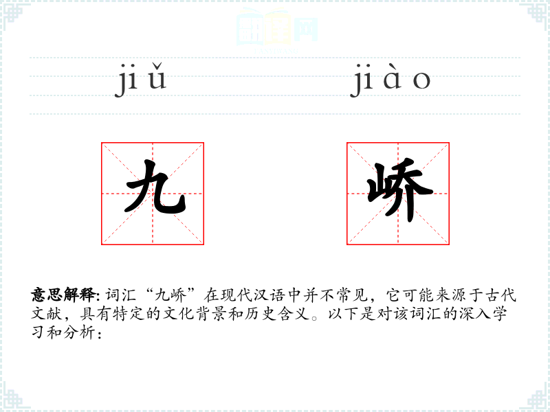 词汇“九峤”在现代汉语中并不常见,它可能来源于古代文献,具有特定的文化背景和历史含义。以下是对该词汇的深入学*和分析: