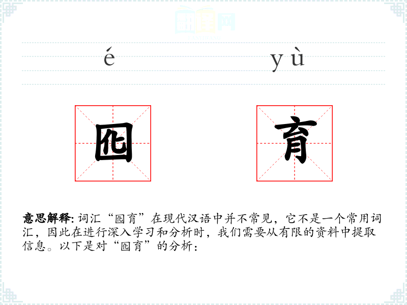 “囮”字的词源可能与古代的狩猎活动有关,而“育”字则是一个古老的汉字,与人类的基本活动——生育和养育紧密相关。随着时间的推移,“囮育”这个词可能因为其特定的含义而没有被广泛使用。
