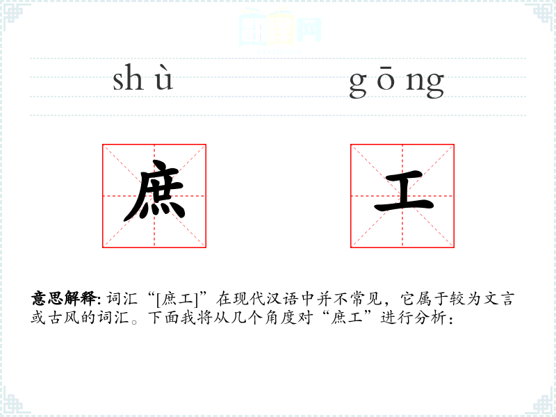 “庶工”字面意思是指普通劳动者或平民工匠。其中,“庶”字常用来指代平民、普通人,“工”则指工匠或工人。
