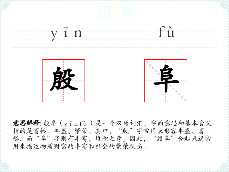 殷阜(yīn fù)是一个汉语词汇,字面意思和基本含义指的是富裕、丰盛、繁荣。其中,“殷”字常用来形容丰盛、富裕,而“阜”字则有丰富、堆积之意。因此,“殷阜”合起来通常用来描述物质财富的丰富和社会的繁荣状态。