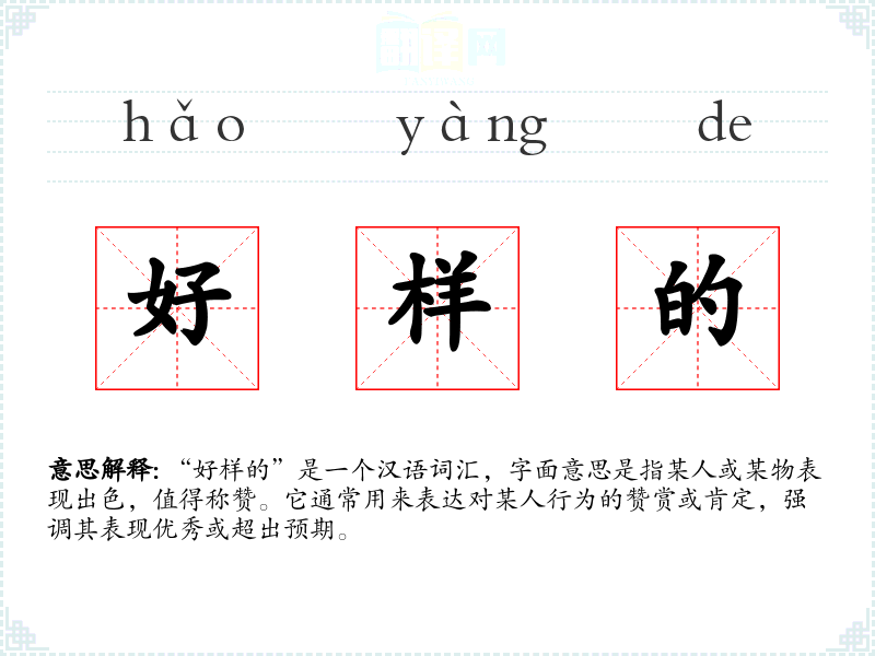 “好样的”是一个汉语词汇,字面意思是指某人或某物表现出色,值得称赞。它通常用来表达对某人行为的赞赏或肯定,强调其表现优秀或超出预期。