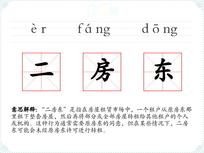 - 反义词:原房东、业主。这些词汇指的是房屋的原始所有者或出租者,与二房东形成对比。