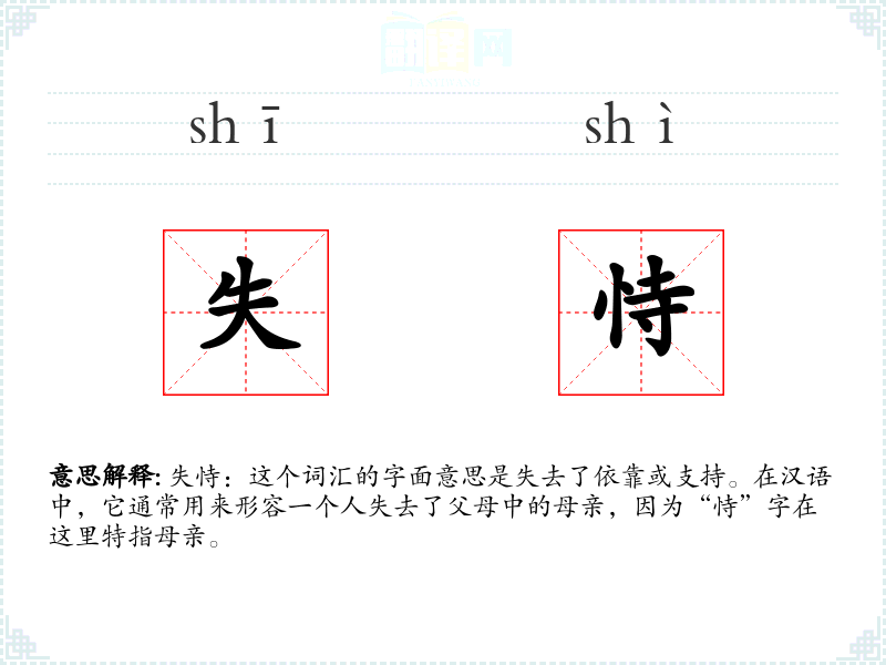 失恃:这个词汇的字面意思是失去了依靠或支持。在汉语中,它通常用来形容一个人失去了父母中的母亲,因为“恃”字在这里特指母亲。