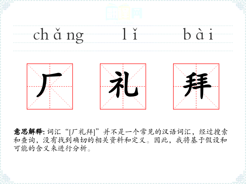 词汇“[厂礼拜]”并不是一个常见的汉语词汇,经过搜索和查询,没有找到确切的相关资料和定义。因此,我将基于假设和可能的含义来进行分析。