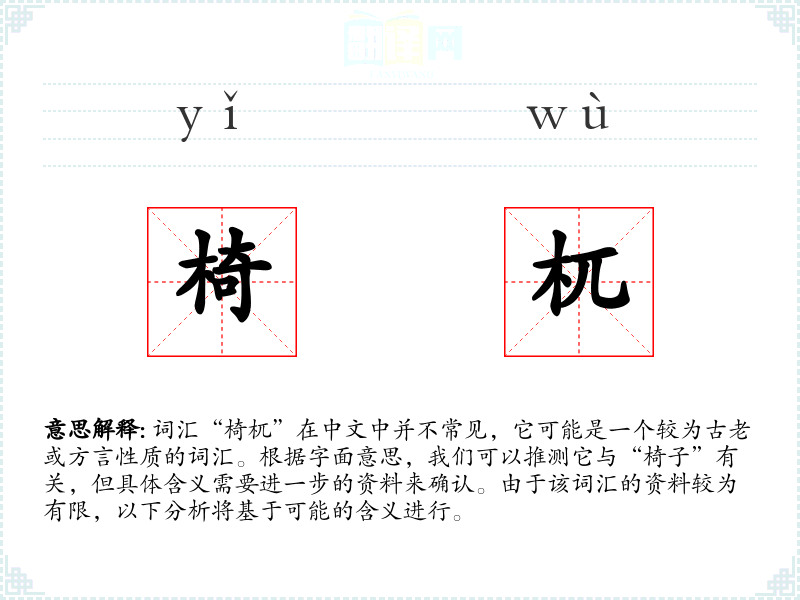 词汇“椅杌”在中文中并不常见,它可能是一个较为古老或方言性质的词汇。根据字面意思,我们可以推测它与“椅子”有关,但具体含义需要进一步的资料来确认。由于该词汇的资料较为有限,以下分析将基于可能的含义进行。